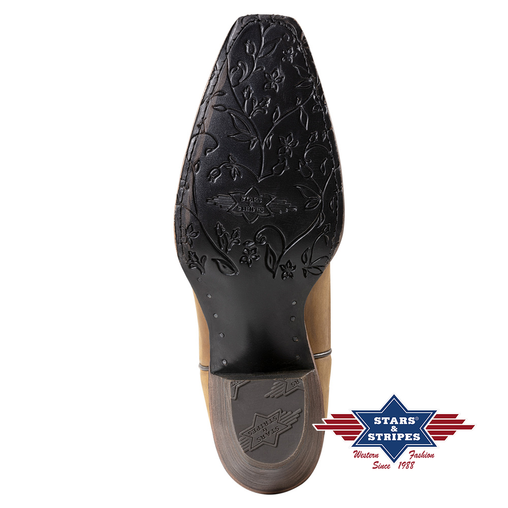 Westernboots aus hochwertigem Rindsleder bestickt und mit extravaganten Applikationen und Nieten gearbeitet. Innensohle, Innenfutter, Absatz und die gemusterte Laufsohle ist ebenfalls aus hochwertigem Rindsleder, nach alter mexikanischer Bootmaker Tradition von Hand gefertigt. Die Sohle ist rahmengenäht und im hochwertigen Goodyear-Welt-Verfahren aufgezogen.