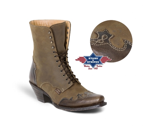 Westernstiefel mit dekorativer Schnürung. Obermaterial, Futter, Absatz und Sohle komplett aus hochwertigem Rindsleder, im Goodyear-Welt-Verfahren aufgezogen.