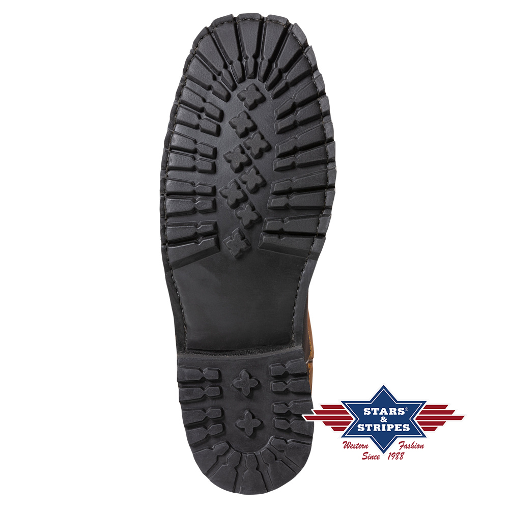 Flotte Workerboots in absolut robuster Ausführung aus hochwertigem Rindsleder mit dekorativen Applikationen und Stickerei, nach alter mexikanischer Bootmaker Tradition im hochwertigen Goodyear- Verfahren von Hand gefertigt. Mit weicher Innensohle, säurebeständiger Gummisohle und Stahlkappe für erhöhte Sicherheit!