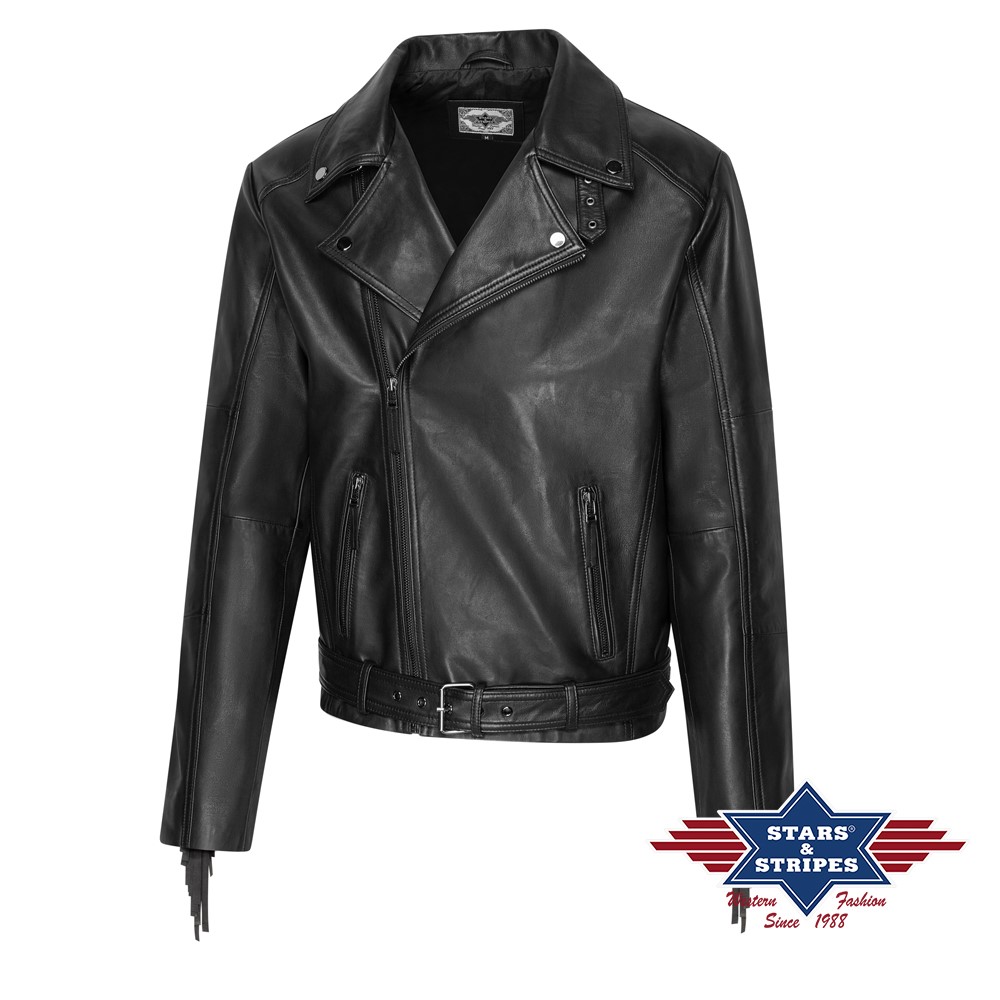 Fransenjacke im Flieger-Design aus sehr hochwertigem, handschuhweichem Nappaleder mit Avio-Effect. Für den Biker unerlässlich. Die Fransen an Ärmeln und Rücken sind abnehmbar durch versteckte Reißverschlüsse. Zwei Innentaschen.