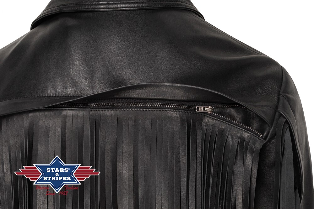 Fransenjacke im Flieger-Design aus sehr hochwertigem, handschuhweichem Nappaleder mit Avio-Effect. Für den Biker unerlässlich. Die Fransen an Ärmeln und Rücken sind abnehmbar durch versteckte Reißverschlüsse. Zwei Innentaschen.