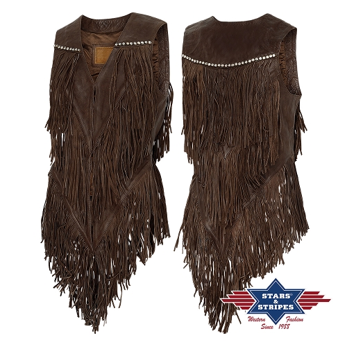 Fransenweste aus weichem Rindsleder, aufwendig mit eingefassten Strasssteinen gearbeitet . Häkchen zum verschließen. Auch in schwarz erhältlich.