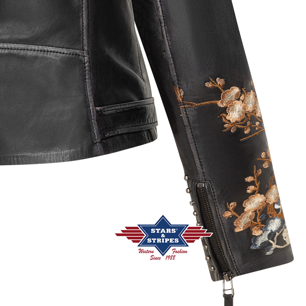 Premiumlederjacke aus hochwertigem, handschuhweichem Nappa. Umwerfend schöne Stickerei an Kragen und Ärmel. Wirkungsvoll mit Nieten bestückt. Reißverschlüsse an Ärmeln und drei Taschen.