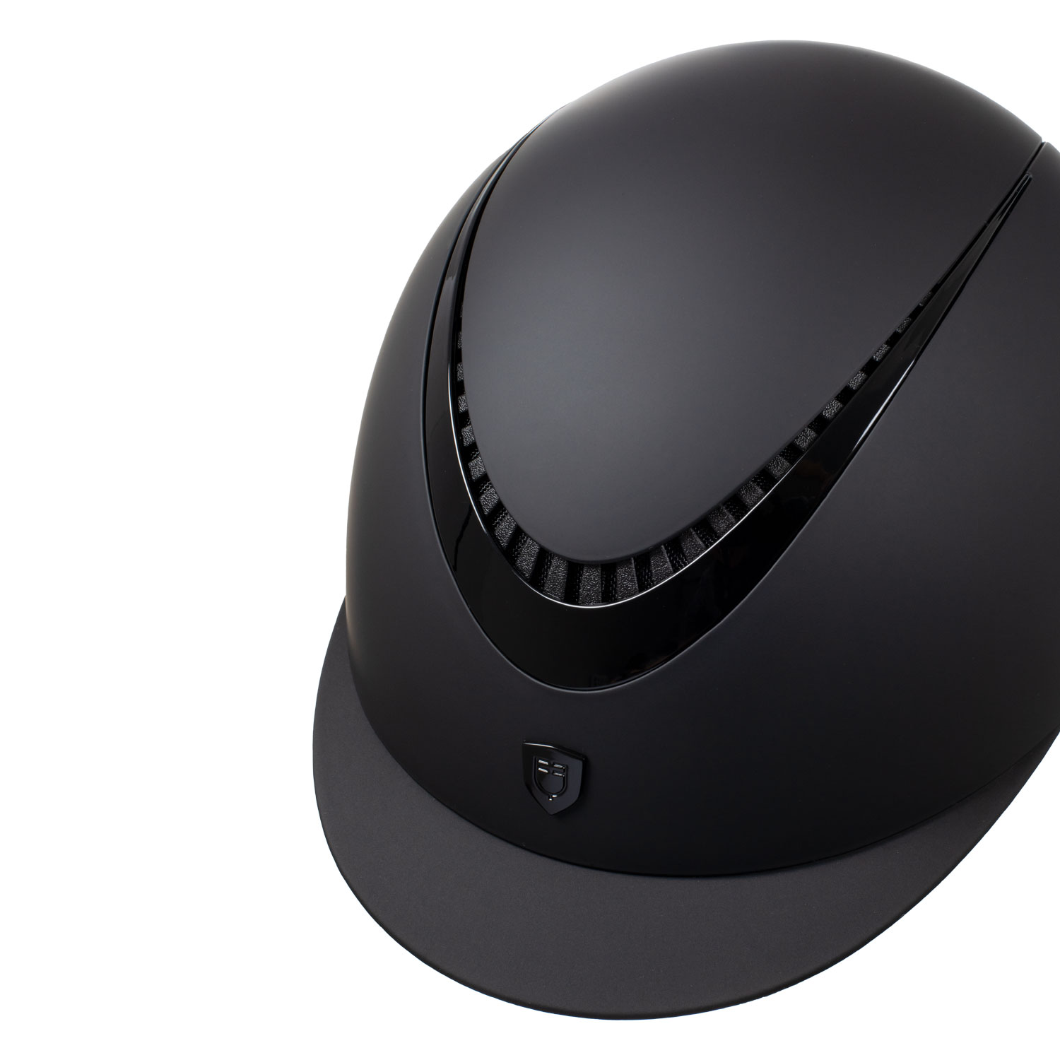 Die ton-in-ton mit dem Rahmen gehaltene Logo-Platte verleiht dem Helm Eleganz und Raffinesse im typischen Equestro-Stil.