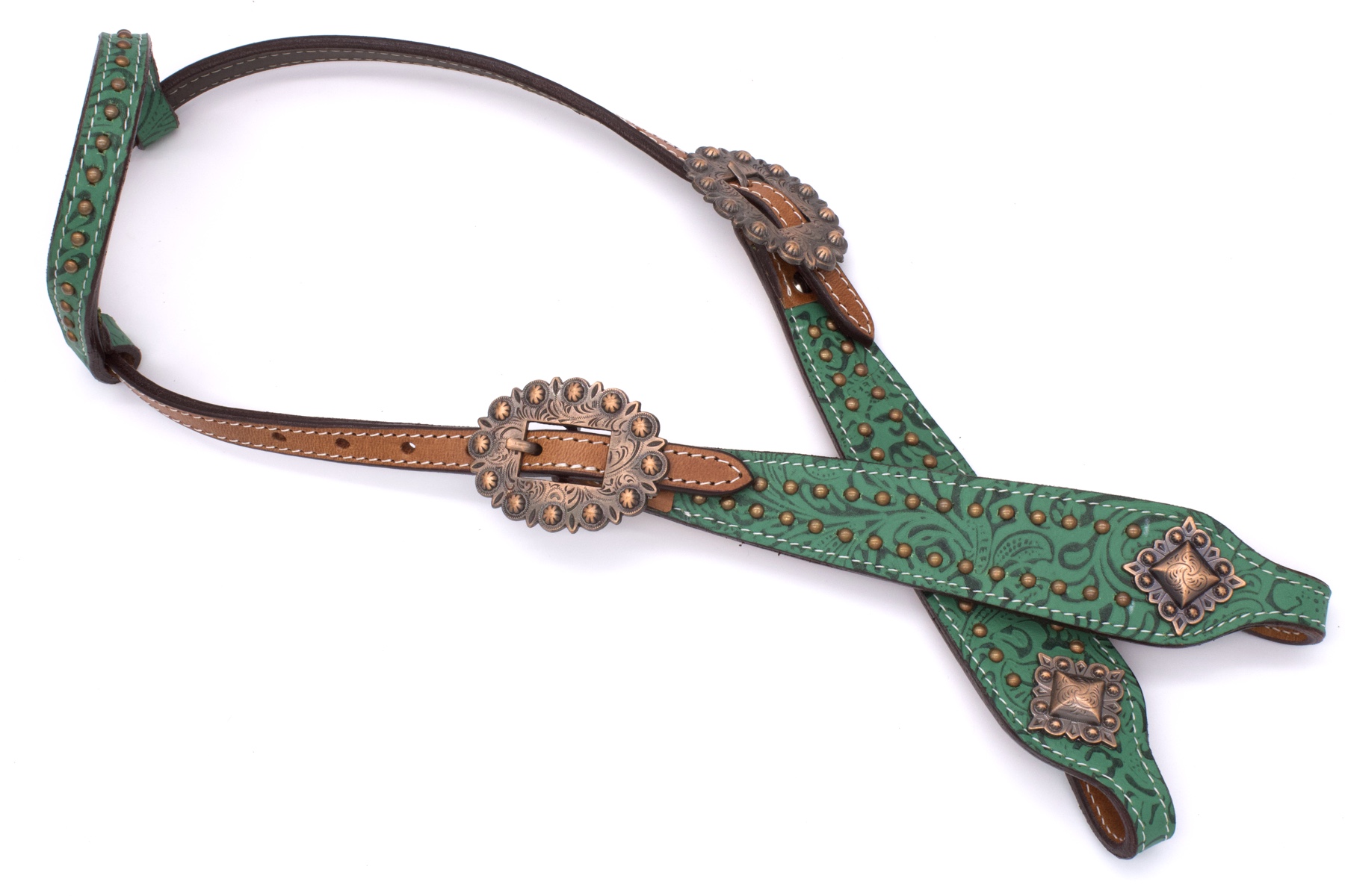 Show Einohr Westerntrense, Kopfstück mit grünem Muster und kufperfarbenen Schnallen