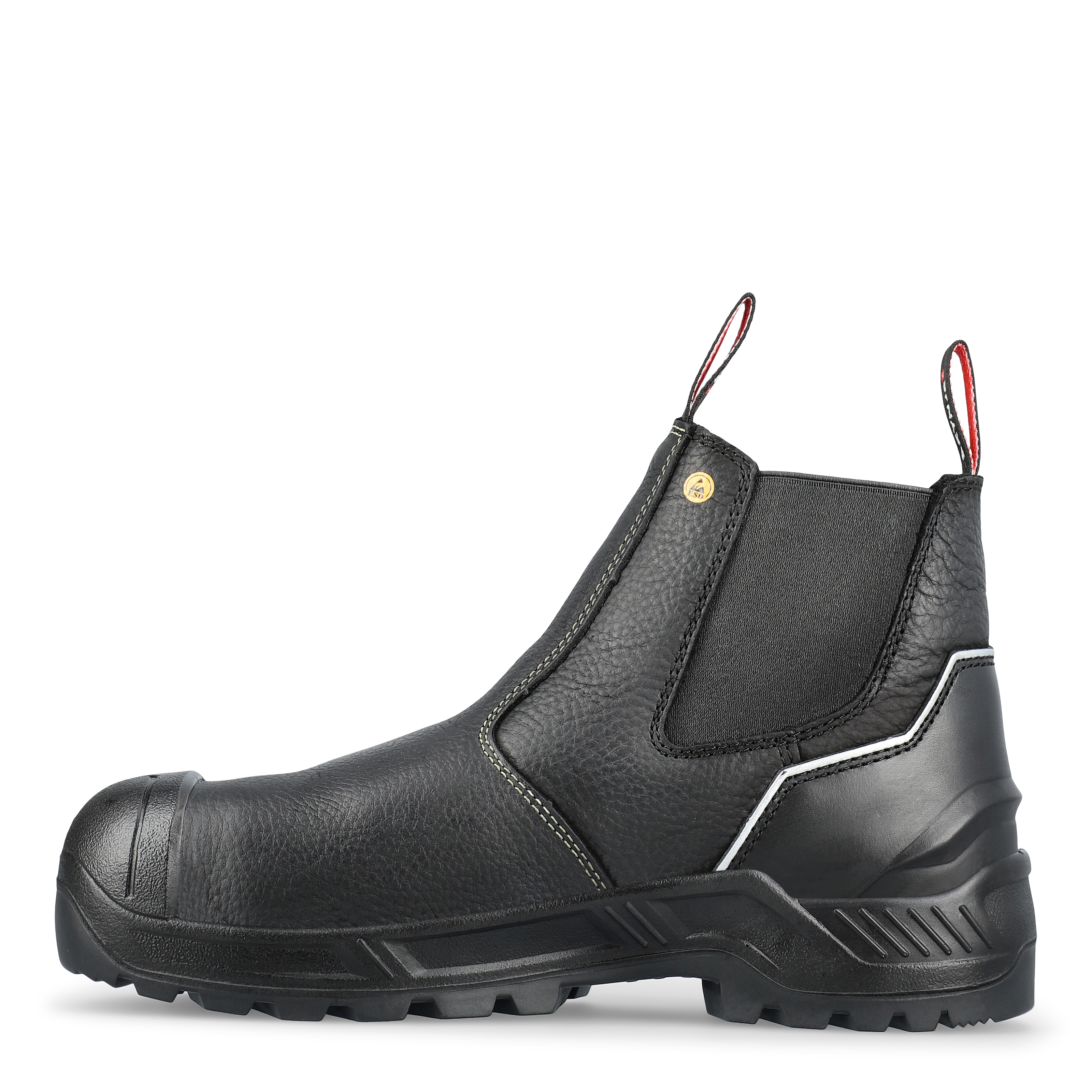 Robuster Sicherheitsstiefel aus atmungsaktivem und wasserabweisendem Leder. Mit kräftigen Laschen aus Nylon und breitem elastischem Einsatz am Schaft, die dafür sorgen, dass der Stiefel leicht an- und auszuziehen ist. Besonders flexible und stoßabsorbierende Laufsohle aus PU/Nitrilgummi, die Temperaturen bis zu 300 °C (HRO) standhält. Die Sohle hat ein stabilisierendes Gelenkstück, das Umknicken verhindert und den Druck auf die gesamte Sohle verteilt. Die Einlegesohle ist aus stoßabsorbierendem und schweißtransportierendem PU hergestellt. Mit ProNose für zusätzliche Verschleißfestigkeit. PVC-frei und ESD-zugelassen.