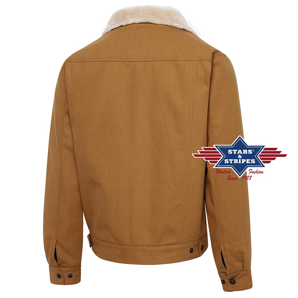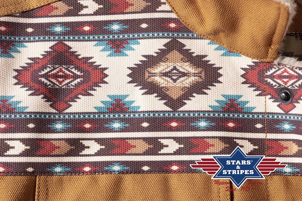 Kurze Western-Canvasjacke mit Innenfutter und Kragen aus warmem Schafspelzimitat. Der Schulterbesatz in edlem Azteken-Design macht diese Canvas-Jacke zum echten Hingucker. Die beiden Brusttaschen, Druckknöpfe aus Metall und zwei Eingrifftaschen machen die Jacke zu einem funktionalen Kleidungsstück und runden das Design perfekt ab.