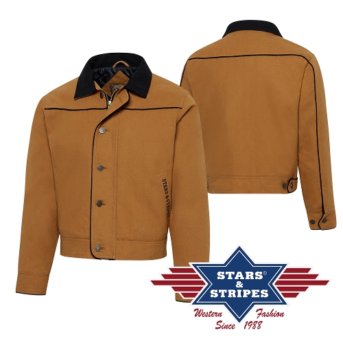 Kurze Western-Canvasjacke, Kragen und Paspelierung farblich abgesetzt. Mit Karosteppfutter, einer Innentasche, zwei Eingrifftaschen, Reißverschluss und Knöpfen ausgestattet.