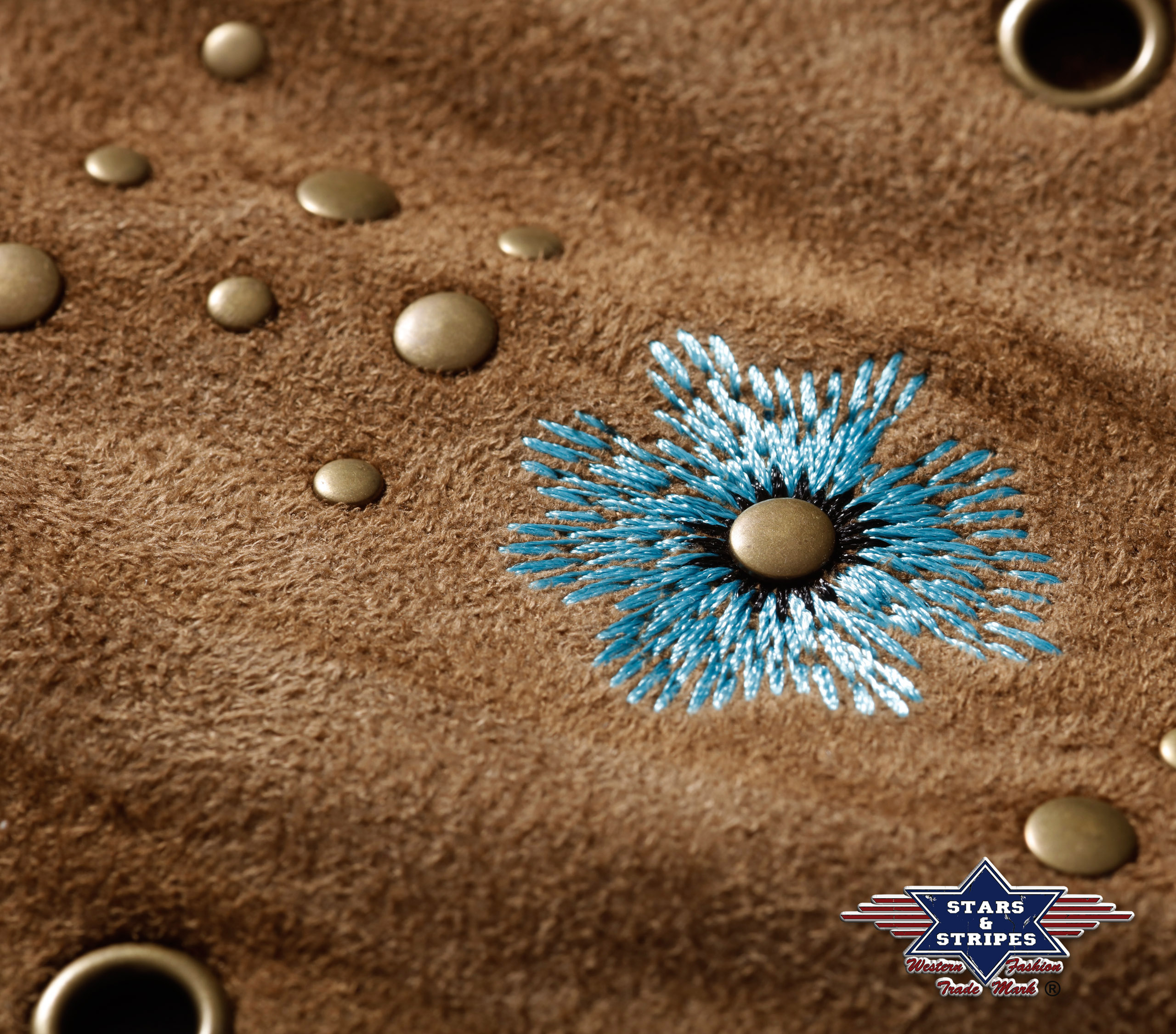 Western Fransenweste aus weicher Mikrofaser in Wildlederoptik, aufwendig gearbeitet mit Stickereien, Bändchen und Nieten.