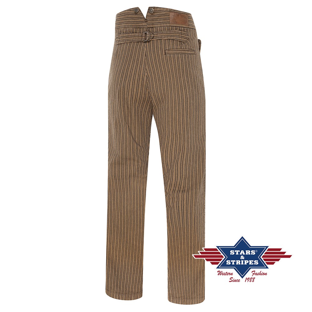 Authentische Western Old-Style Hose aus leichtem Baumwollstoff mit hohem eingekerbten Bund und dekorativen Metall-Knöpfen für Hosenträger. An der Rückseite ist sie durch einen Querriegel verstellbar. Sie besitzt 2 Fronttaschen und eine Gesäßtasche. Passend zu Weste EARL.