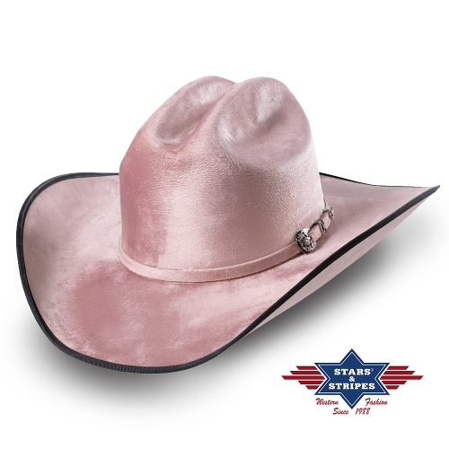 Roséfarbener Westernhut aus Polyester. Das Hutband mit exklusiver Schnalle ist dezent mit kleinen Strass-Steinchen besetzt. Der Hut ist strapazierfähig, formstabil, wasserabweisend und hat ein größenverstellbares Innenband.