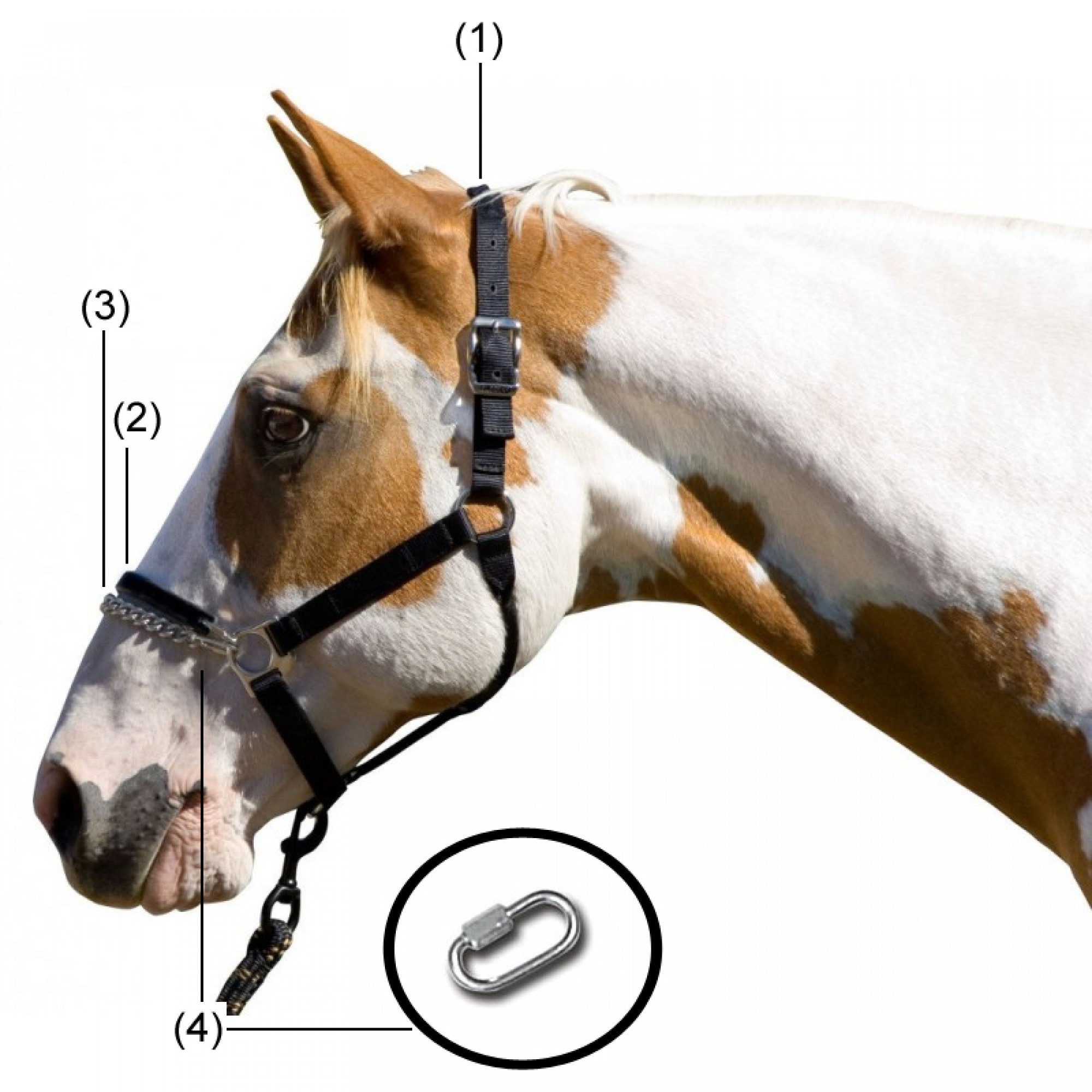 Bezpečnostní upozornění: Kvůli speciální konstrukci není ohlávka vhodná pro uvázání v přívěsu. Koně by neměli být ponecháni bez dozoru na pastvině, v boxu nebo uvázáni.