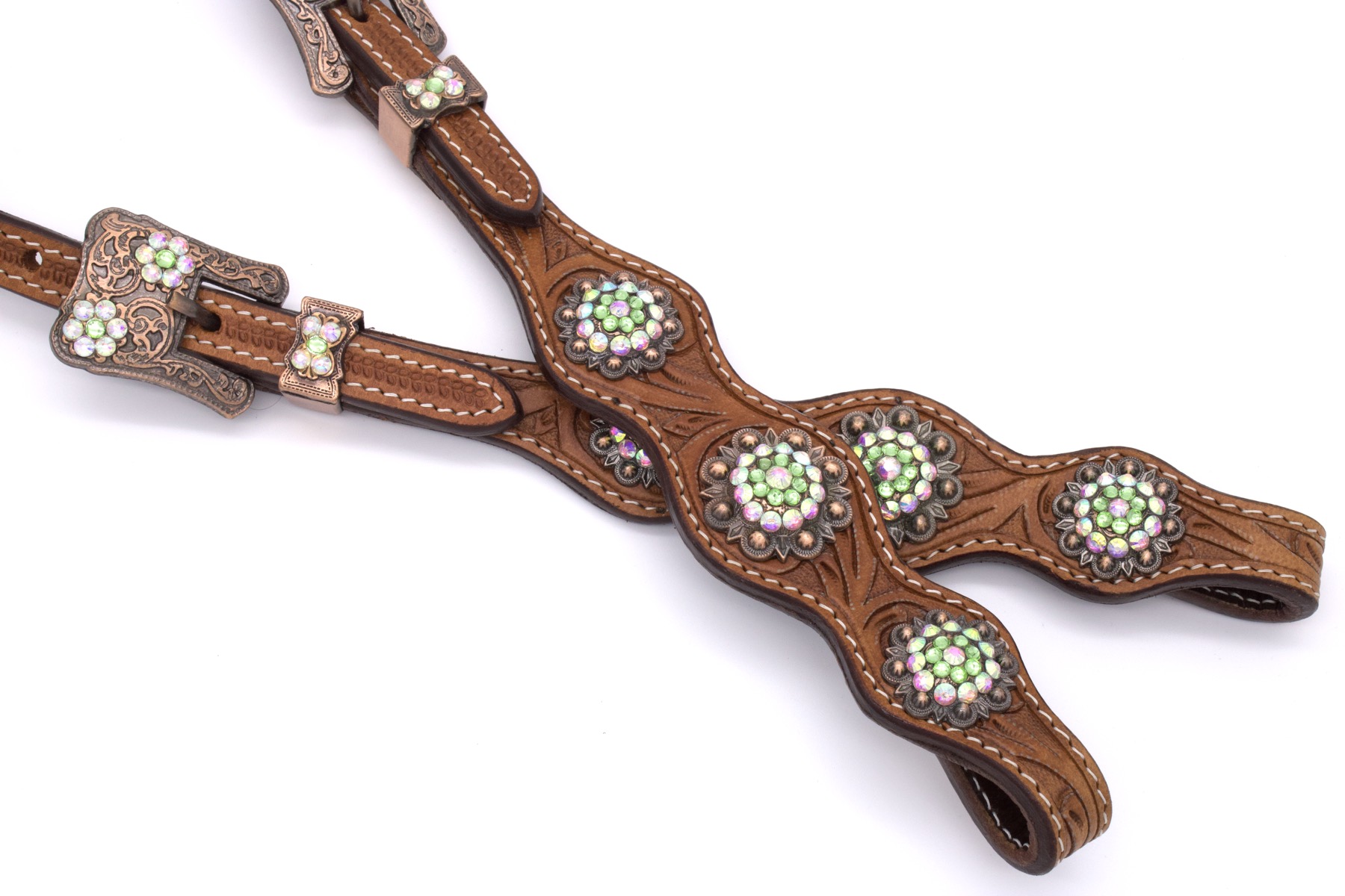 Elegantní dvouuchá westernová uzdečka s perleťovou ušní smyčkou světle zelené barvy.