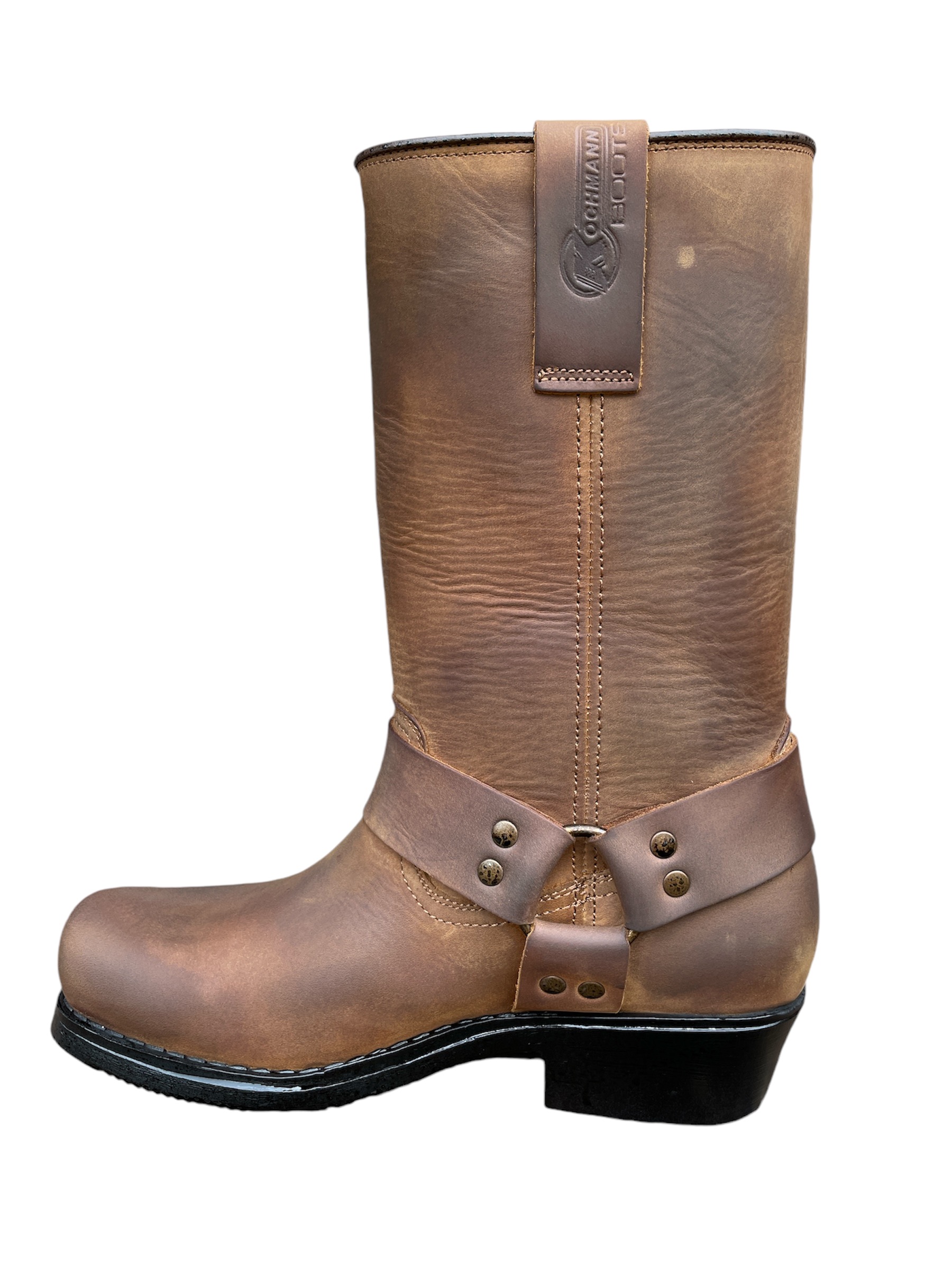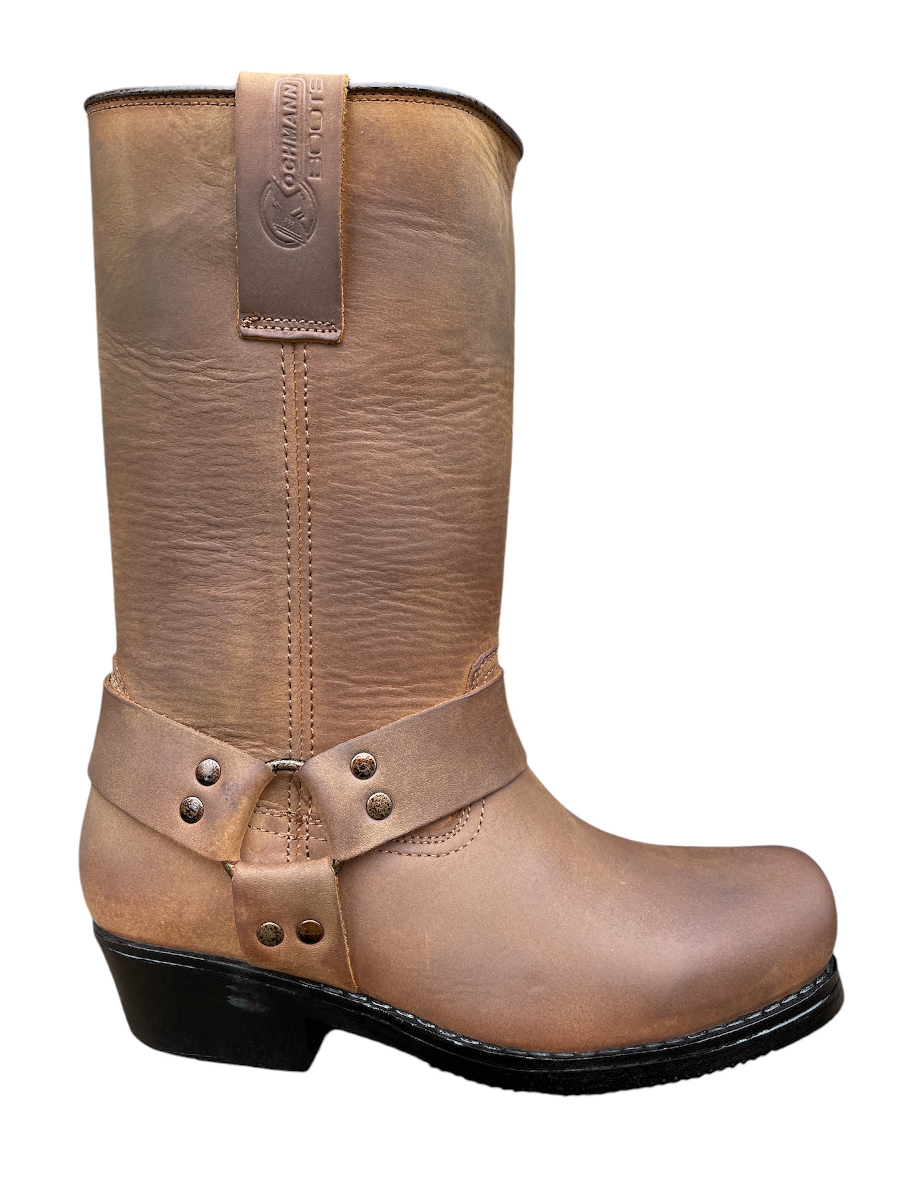 Pánské a dámské motorkářské boty Kochmann z hovězí nubukové kůže. Poutka na stažení s dvojitým prošíváním. Bez zipu na vnitřní straně. Kroužky a nýty s antikorozní úpravou. Podrážka s protiskluzovým vzorkem.