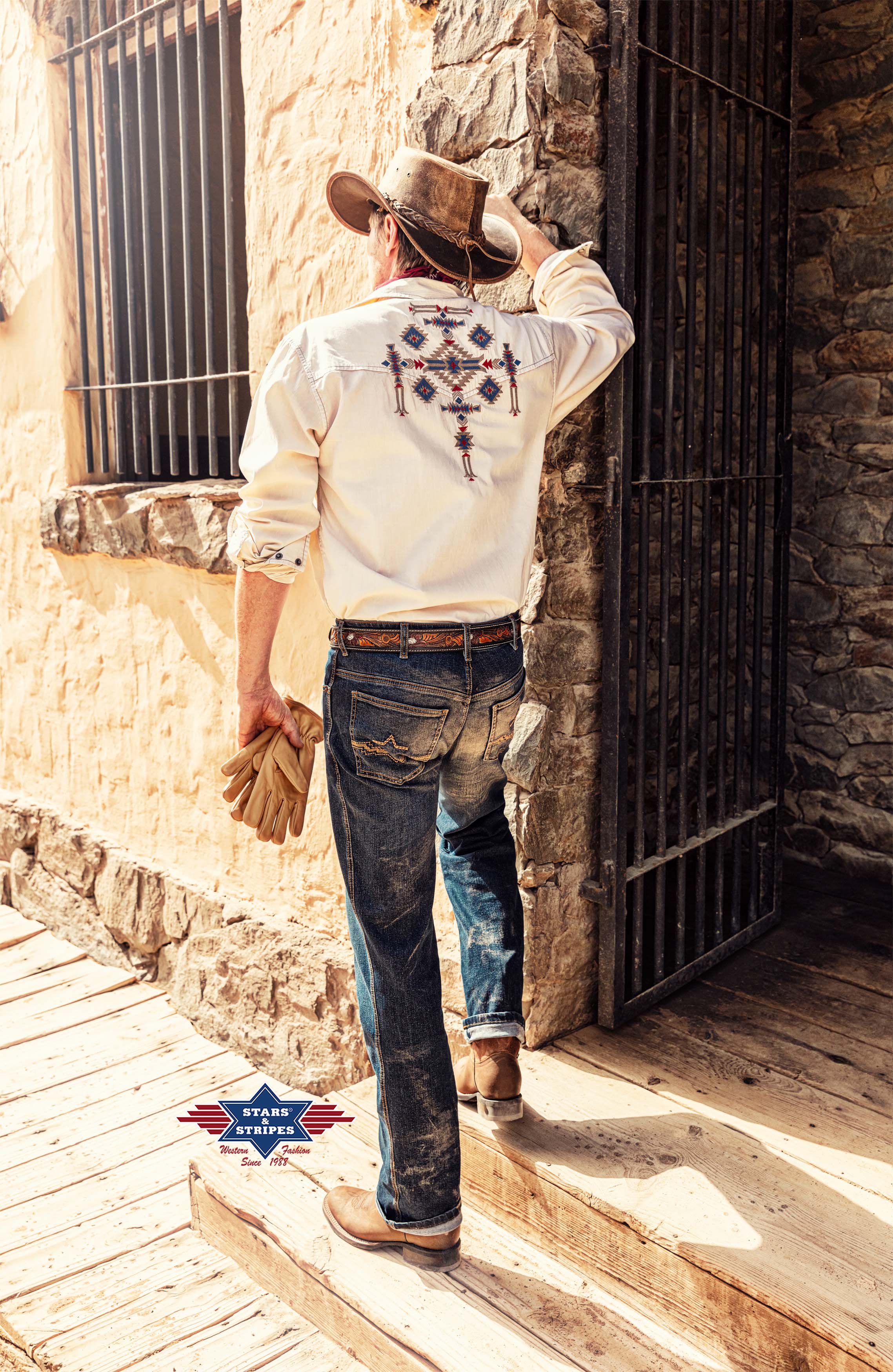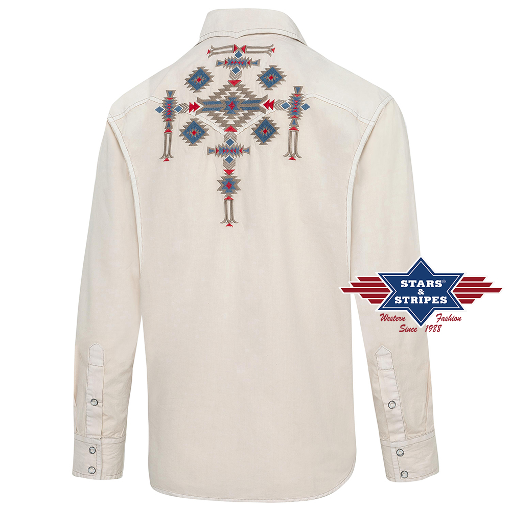 Neobvyklá westernová košile v béžové barvě se světlým praním a výraznou výšivkou v aztéckém stylu. Jemné westernové sedlo, tmavé ozdobné prošívání, béžově zbarvené patentky a náprsní kapsy s nášivkami dělají z této westernové košile naprostý unikát. Hodí se k westernové blůze Betty.