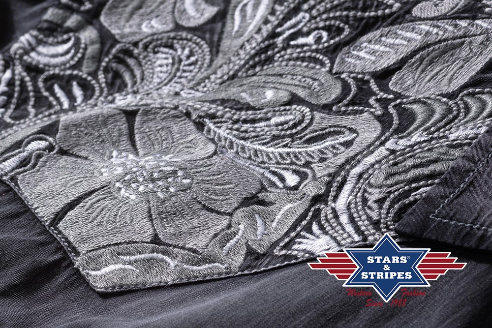 Parádní westernová košile v zašlém vzhledu s propracovaným vyšívaným, přiloženým westernovým sedlem v květinovém designu. Náprsní kapsy s nášivkami, světlé ozdobné prošívání a černé patentky dělají z této košile nezbytnou výbavu každého kovboje. Hodí se k westernové blůze Wilma.