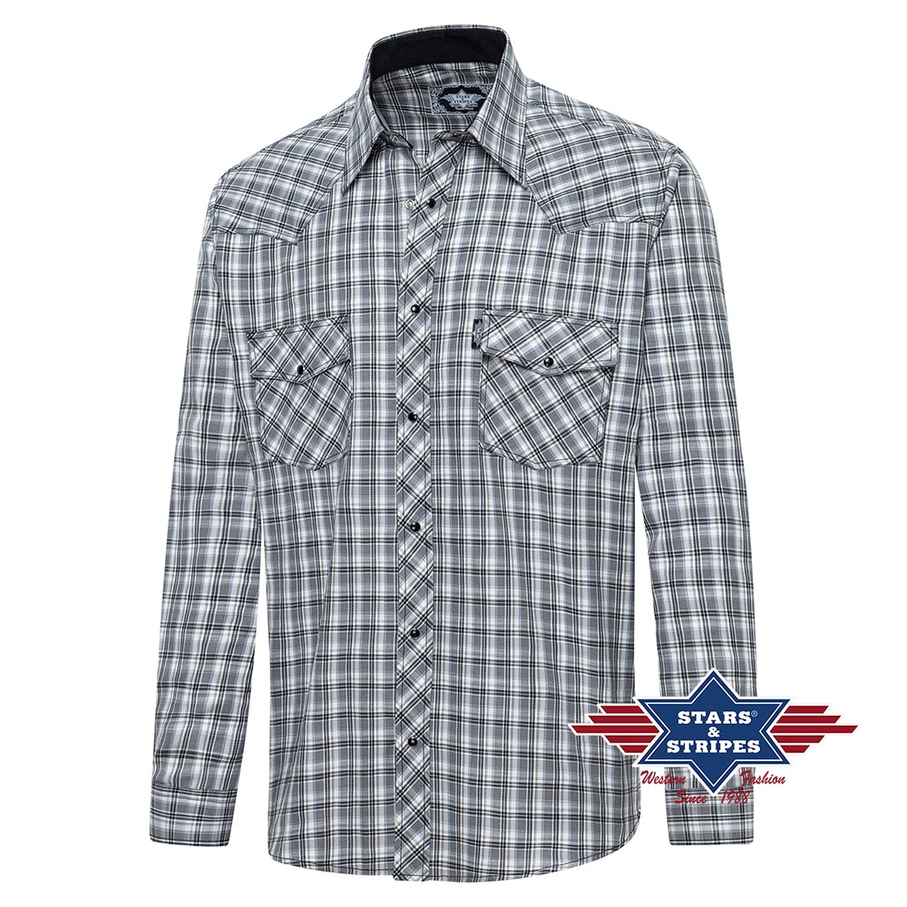 Kostkovaná westernová košile s westernovým sedlem a náprsními kapsami s nášivkami. Látkový lem v límci ve stejné barvě jako košile doplňuje design. Šířku manžet lze individuálně upravit pomocí dvojité řady knoflíků. Shodné patentky na knoflíkové léze dělají z košile opravdovou ozdobu.