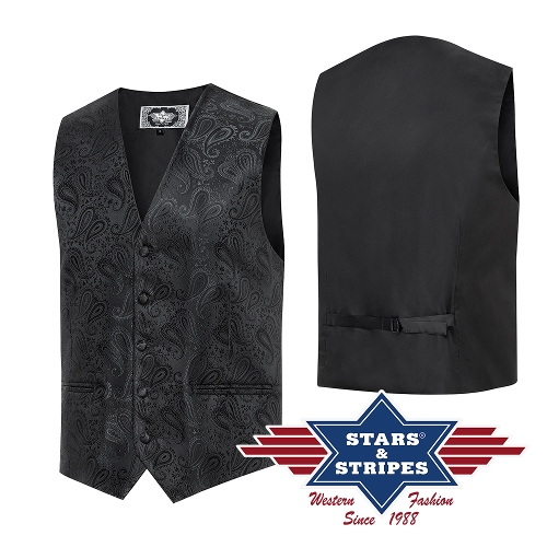 Westernová žakárová vesta se dvěma prostřiženými kapsami, vzadu nastavitelná pomocí příček. Barva černá