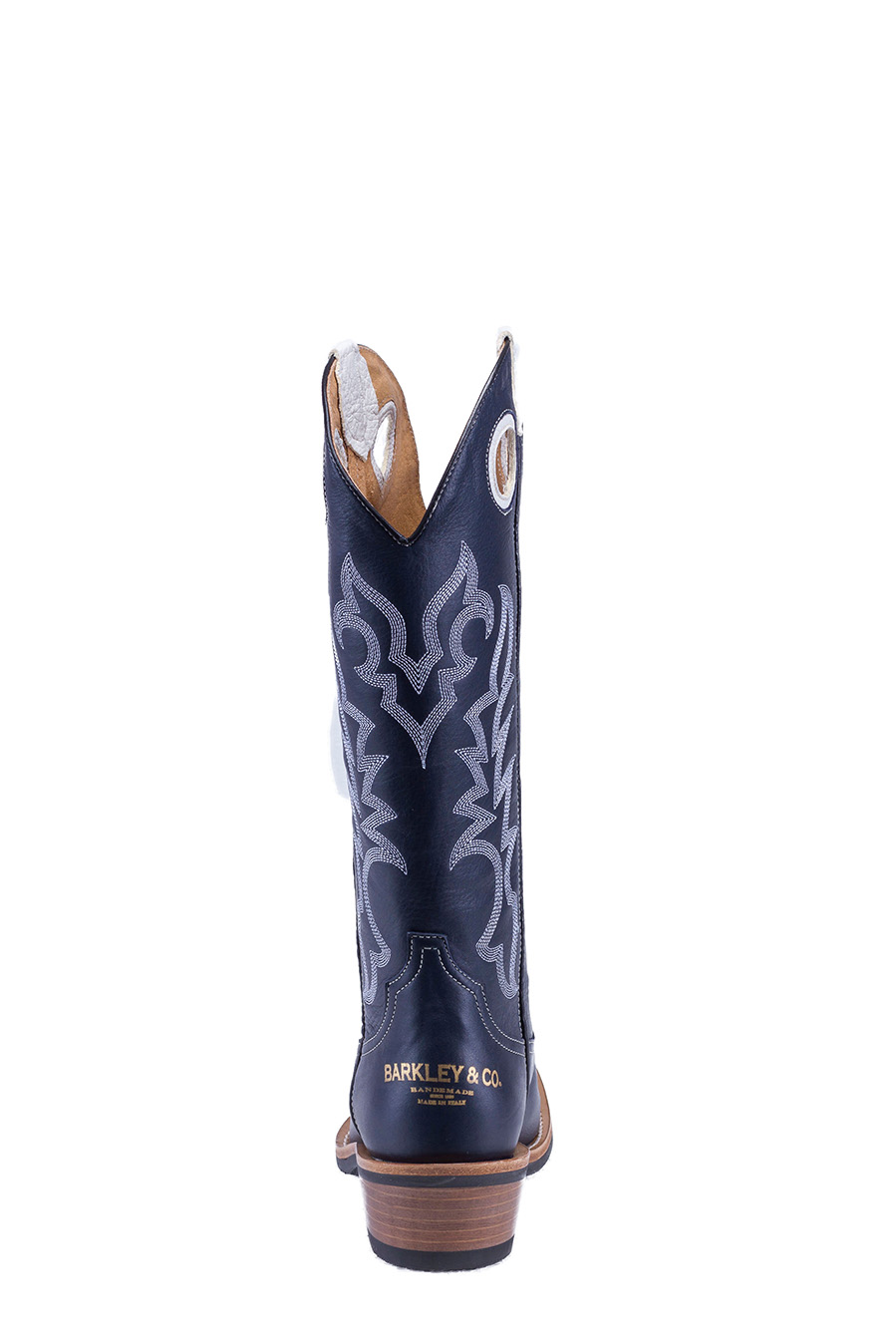 Boty z olejované telecí kůže, čtvercová špička, barva námořnická modř, efektní prošívání na stonku, podšívka z kůže, gumová podrážka, kompletně ručně šité.