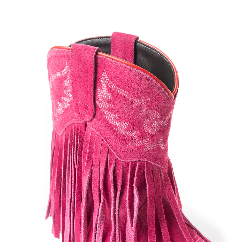 Westernové kotníkové boty z fuchsiově zbarveného semiše s třásněmi
