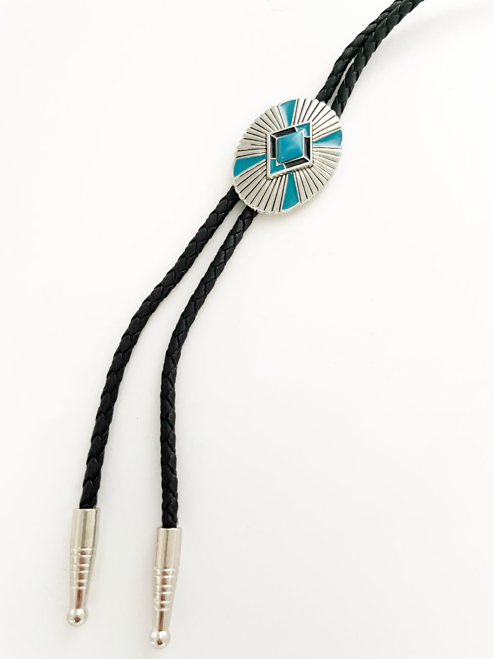 Western bolotie with turquoise concho and ray-shaped embellishments. Black band and silver tips.