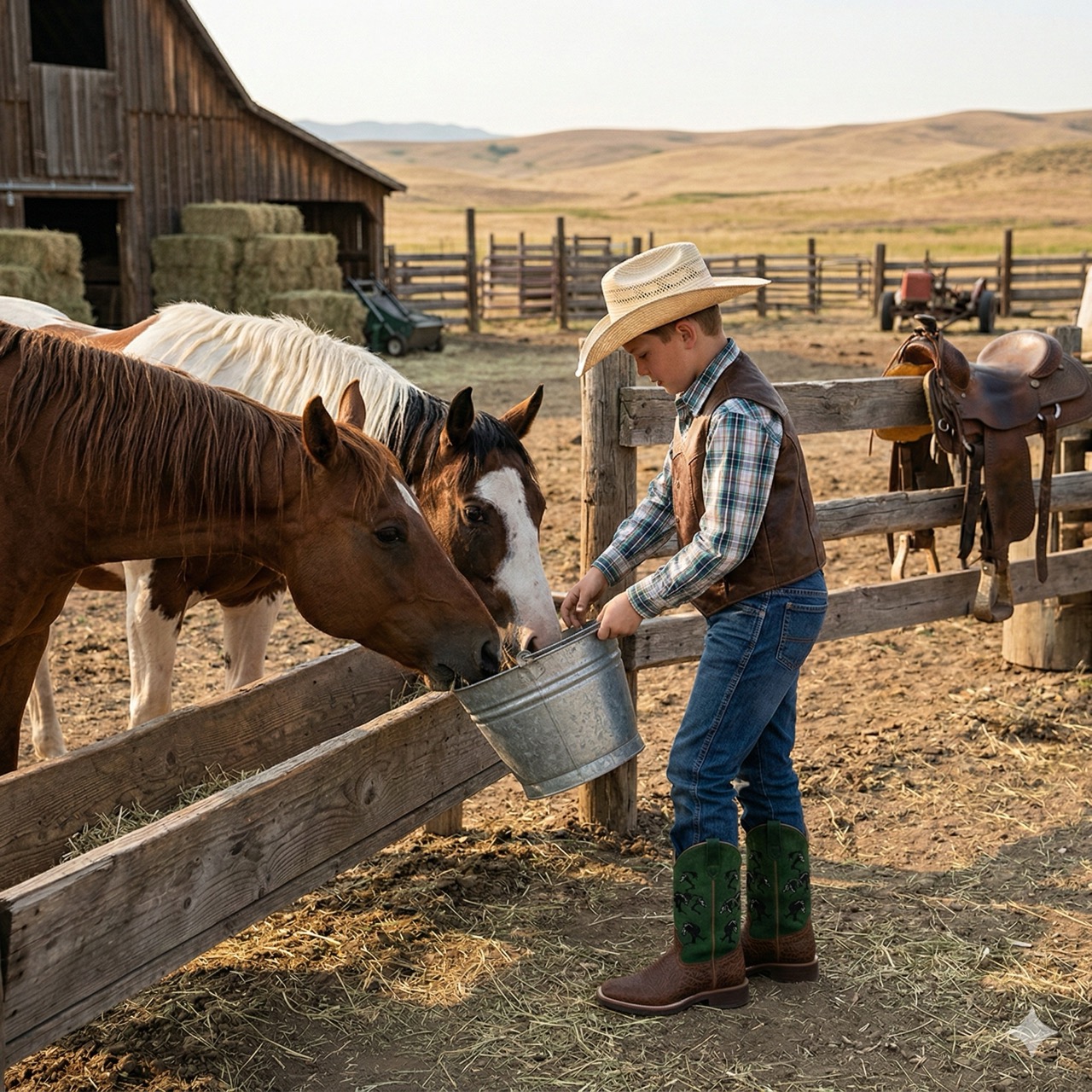 Cowboy boots for children OLD WEST Brown Bull Hide Print Foot with Green Crunch Shaft