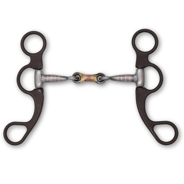 Noble snaffle bit with shanks and copper inlay for improved chewing action.