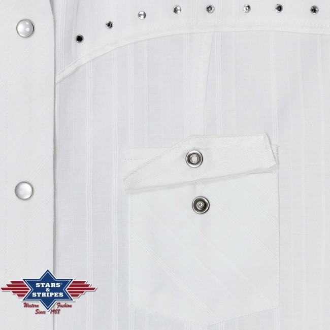 Short-sleeved western blouse with satin piping and rhinestones on the chest and back. The satin trim on the button placket, neckline and pocket flaps is a special accent. With press studs. Slightly rounded hem.