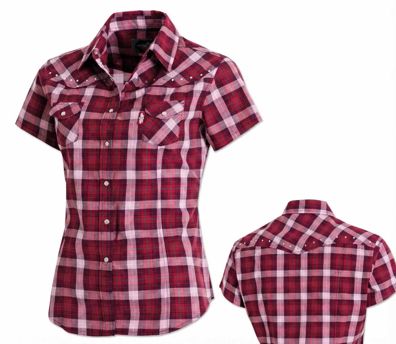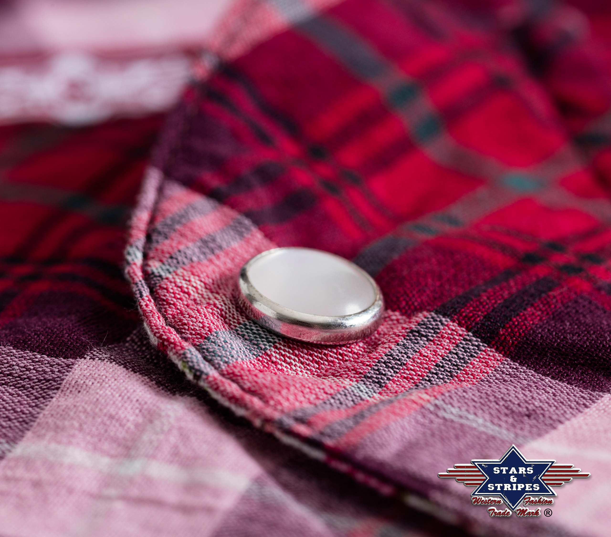 Lightweight chequered short-sleeved blouse with rhinestones on the chest and back yoke. The floral trim on the inside of the button placket and pocket flaps is a special accent. Button placket with mother-of-pearl press studs. Slightly rounded hem.