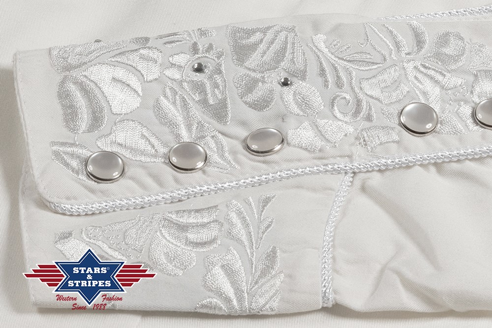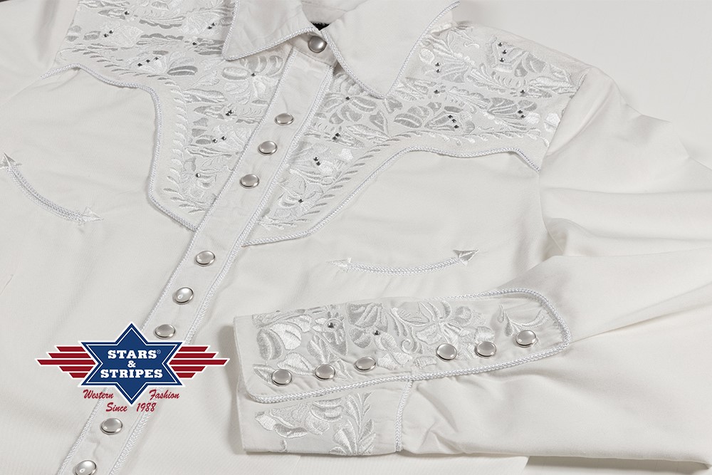 Exquisite white western blouse with a western yoke with magnificent embroidery on the chest and back and delightful rhinestones. Harmoniously coordinated with cord piping and six-button cuffs.