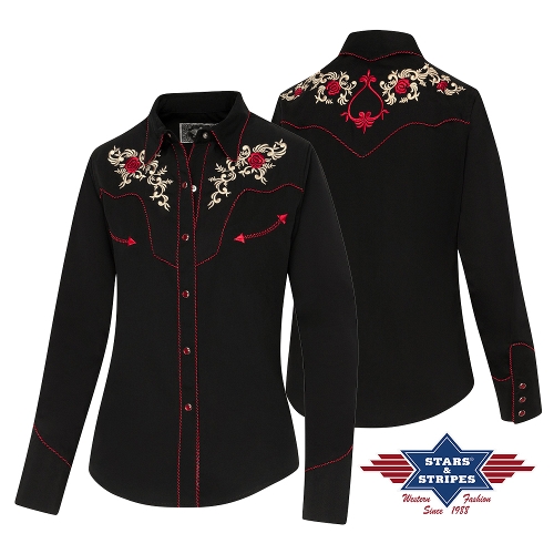 Exquisite western blouse with two-colour embroidery on the chest and back. The western yoke is set off by two-coloured cord piping. Fake smileys and the triple-buttoned cuffs reflect classic western fashion. The blouse combines an easy-care texture with a tailored fit that flatters the figure and makes it a real eye-catcher, and not just for western fans. Matching shirt MILTON