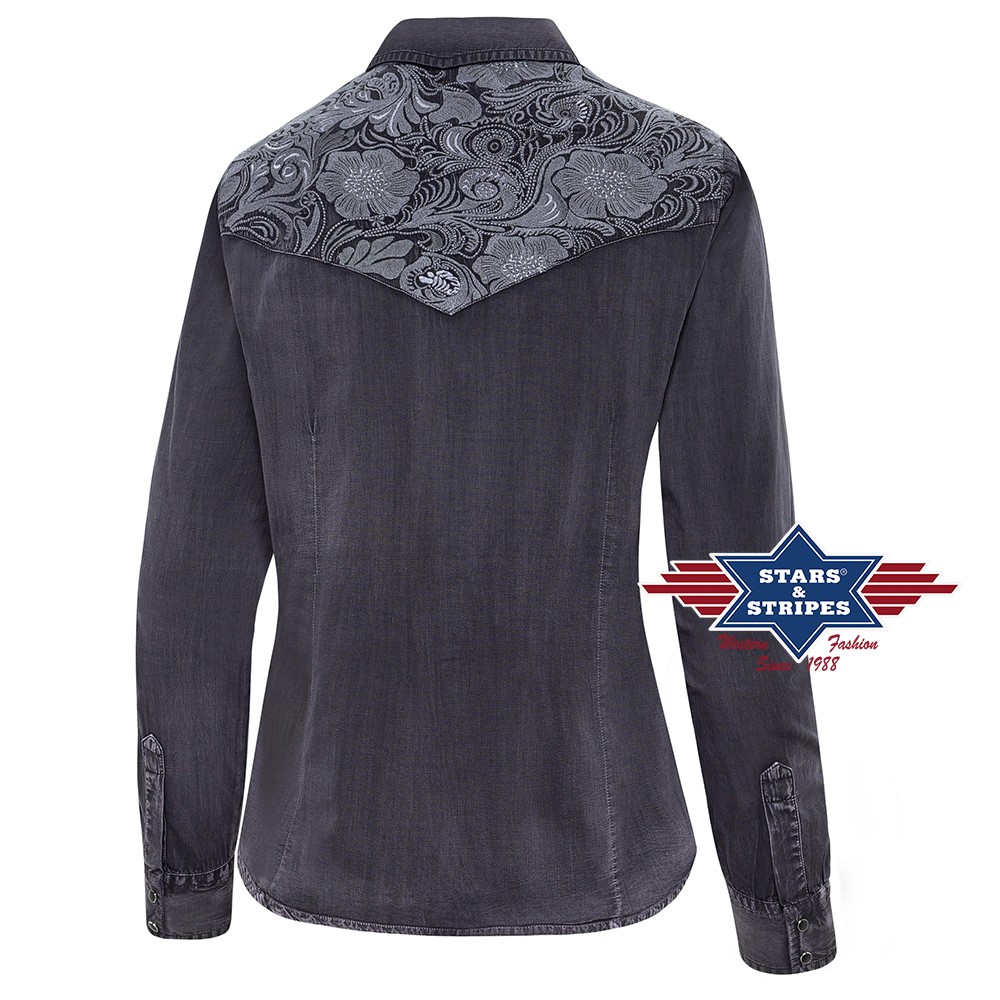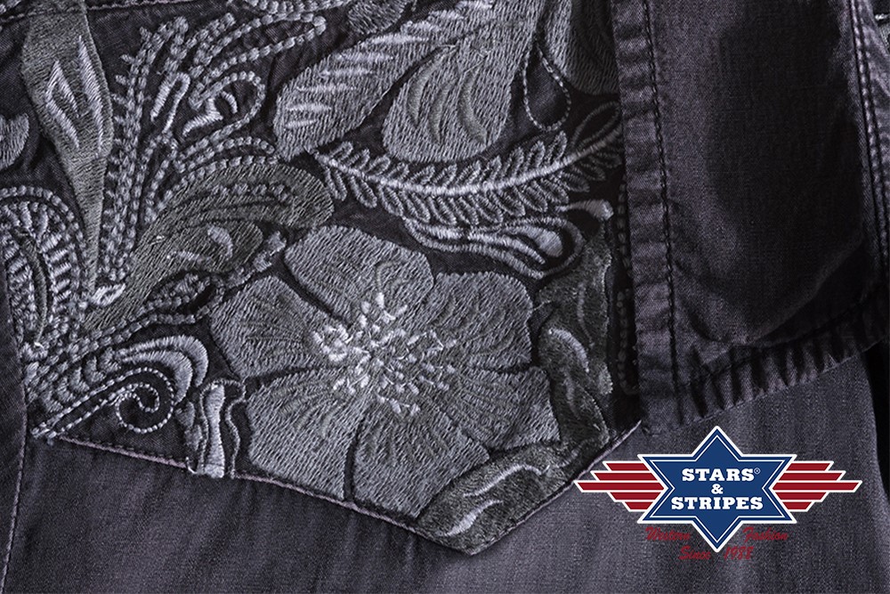 Cool western blouse in a fade-out look with an elaborately embroidered, attached western yoke in a floral design. The patch breast pockets, the light-coloured decorative stitching and the black press studs make this blouse a must-have for every cowgirl. Matches the Fred western shirt.