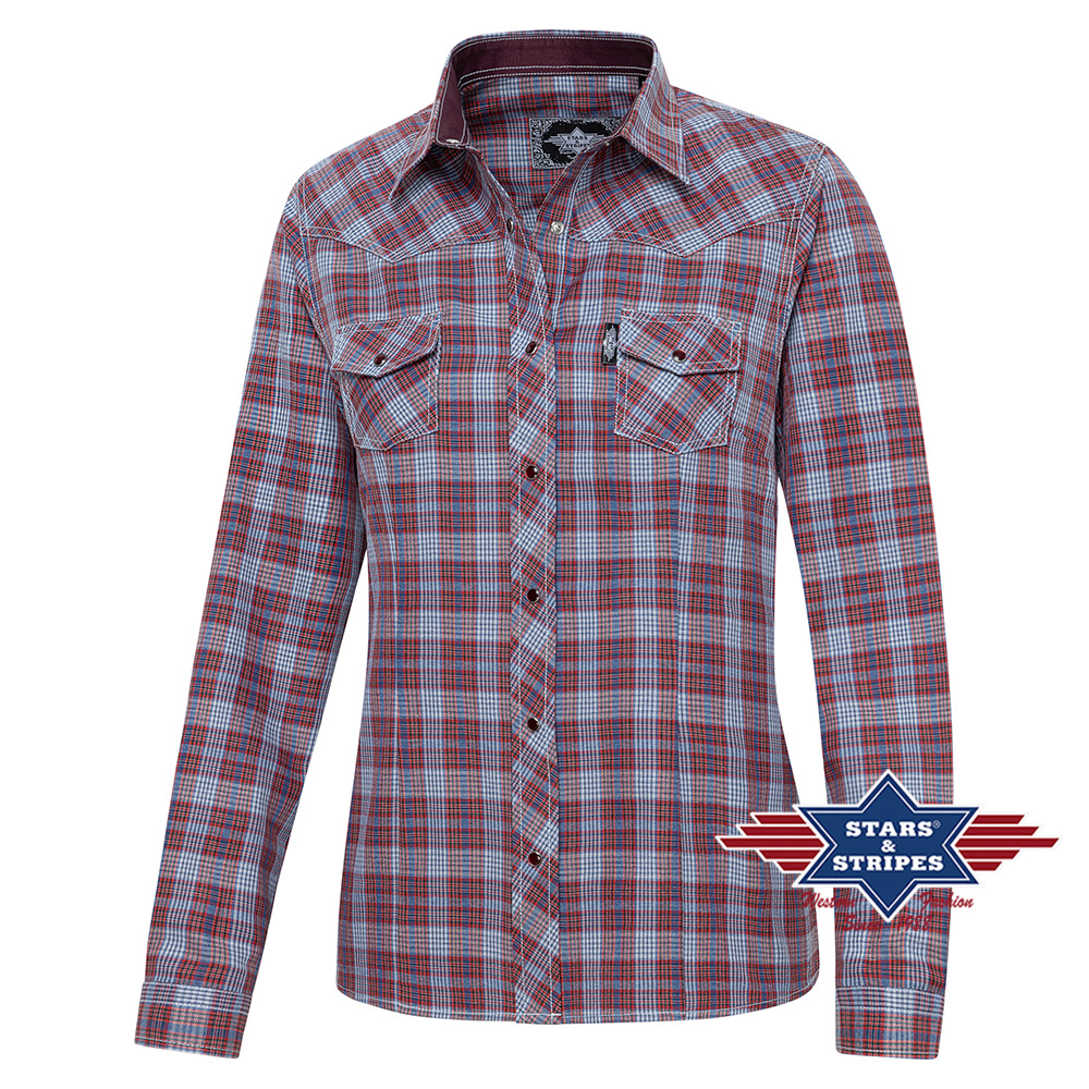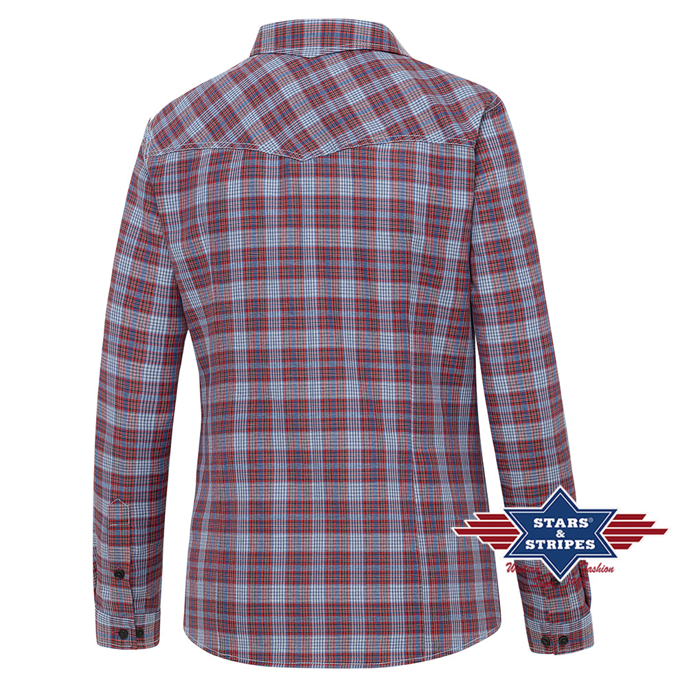 Check blouse with western yoke, patch breast pockets, press studs and satin trim at the neckline