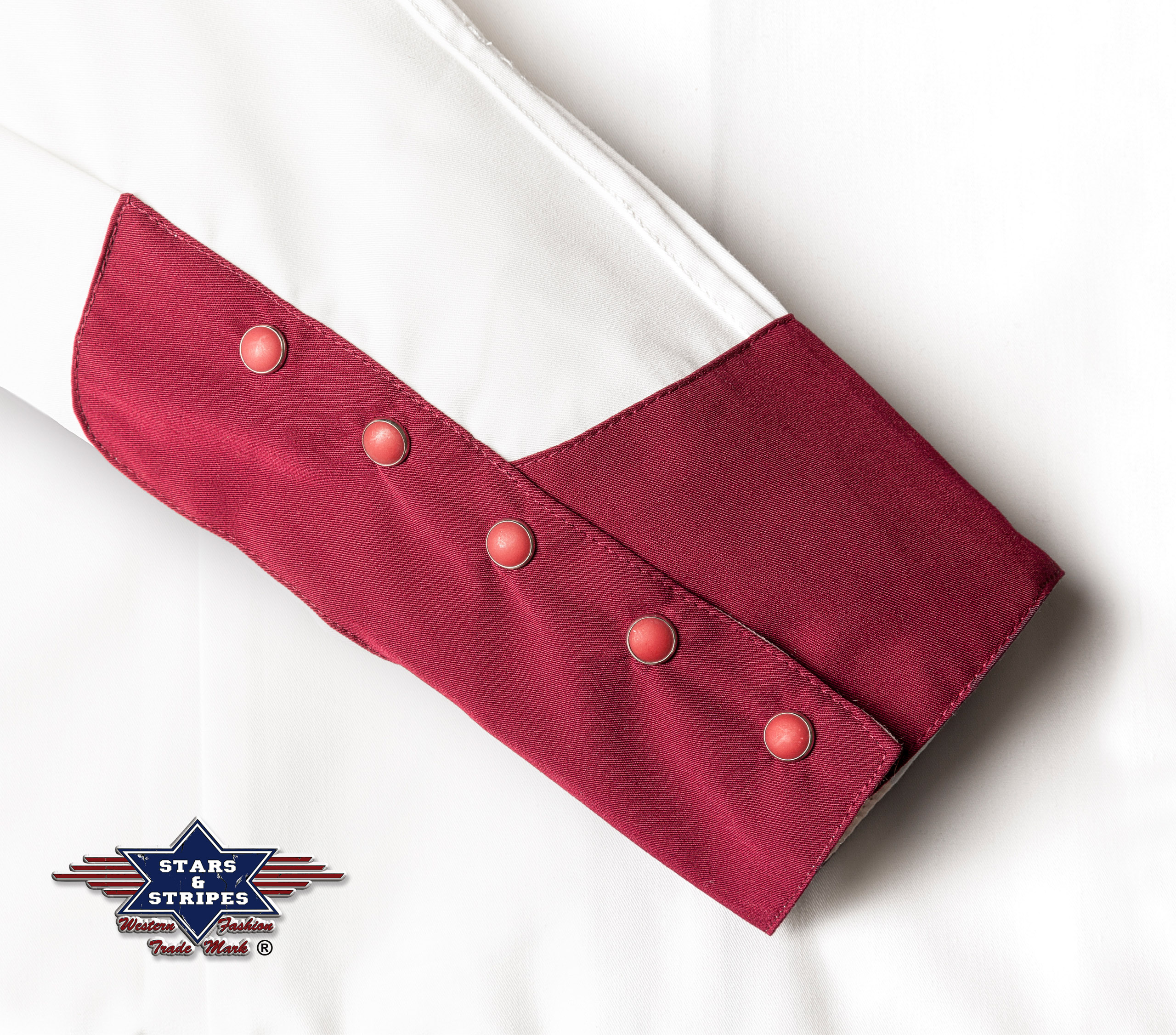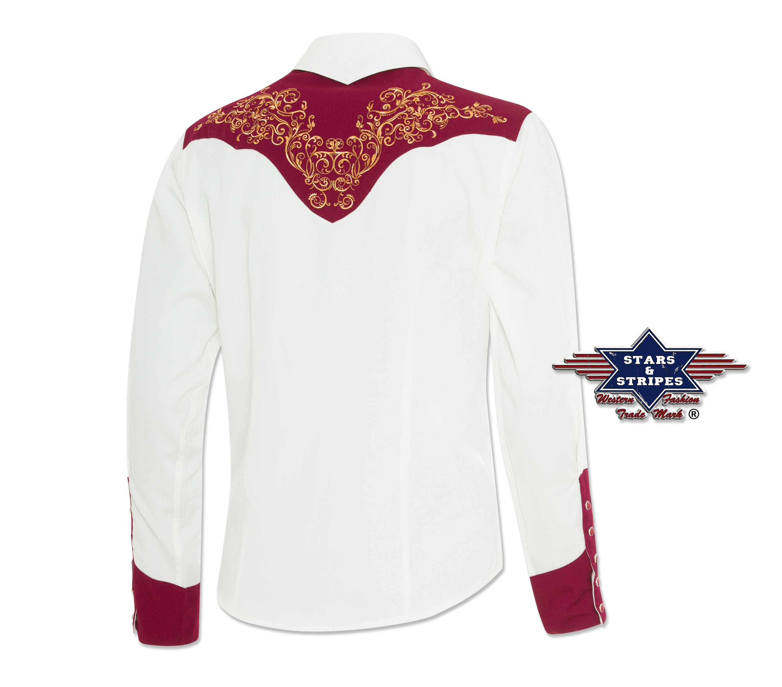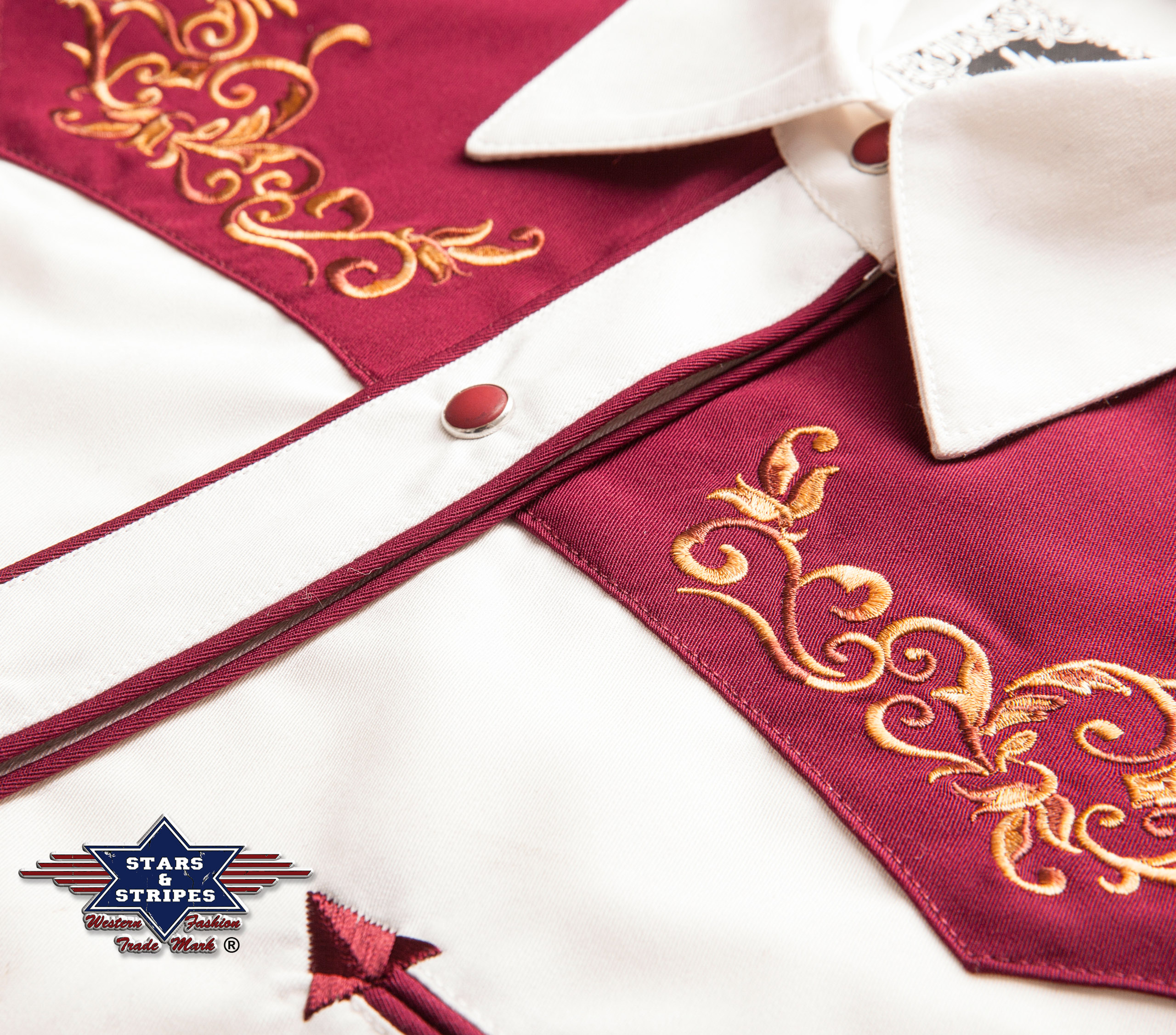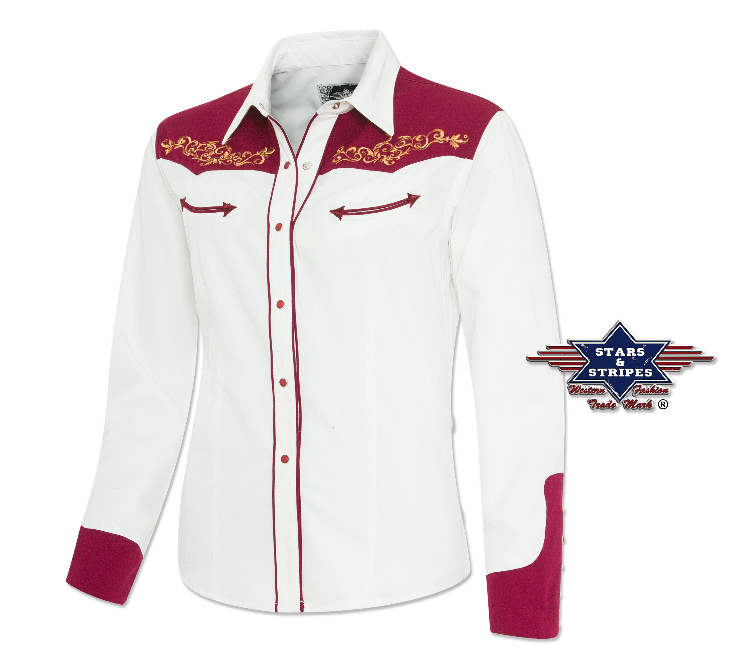 Gorgeous two-tone western blouse with gold-coloured embroidery on the chest and back yoke. Press studs adorn the decorative western cuffs and the button placket. The indicated breast pockets are a highlight.