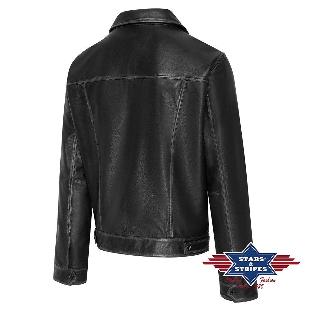 Soft western / biker lamb leather jacket with a stone effect. Two slit pockets, two chest flap pockets with press studs and two inside pockets. The classic denim jacket cut adds an irresistible touch.