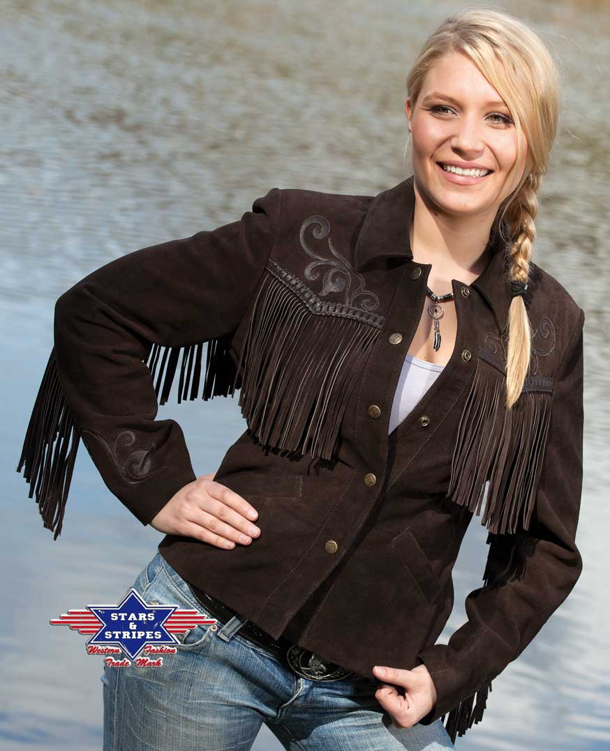 Impressive Western leather jacket made of cowhide suede with fringes and ornate inlays in nappa leather in a stylish design.