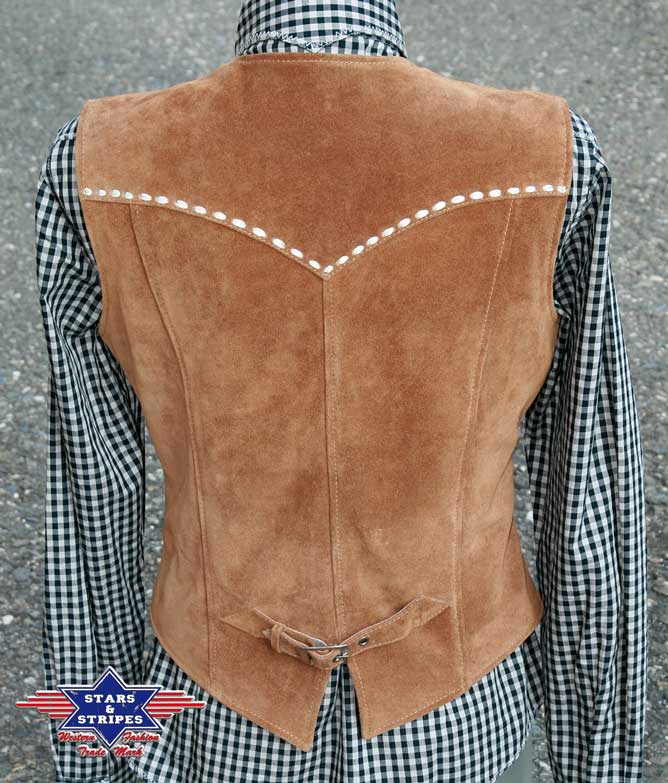 Western leather waistcoat made from first-class cowhide suede. Front with contrasting stitching, embroidery, stud embellishment and two patch pockets. Contrasting topstitching on the back, adjustable bar and a V-shaped notched hem. With decorative metal press studs.