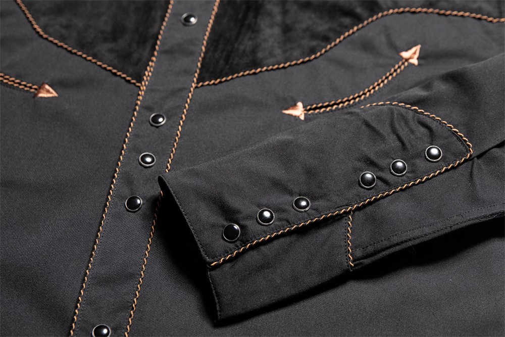 Black western shirt with contrasting western yoke in suede look. With a large, elaborately embroidered eagle on the back, whose wings are embroidered over the shoulders to the front. The two-colour cord piping, smiley pockets, press studs and 6-button cuffs make this elegant western shirt a real eye-catcher.