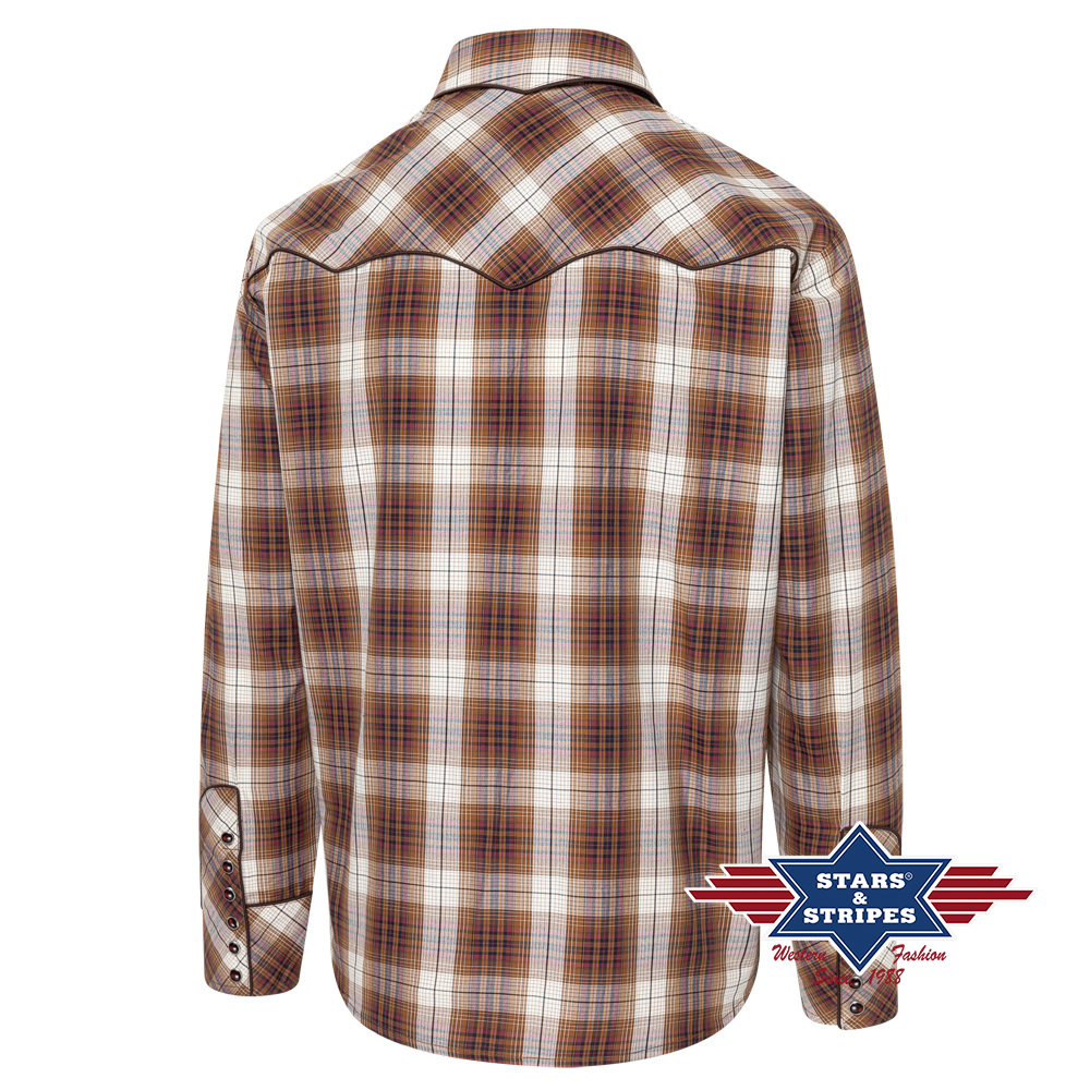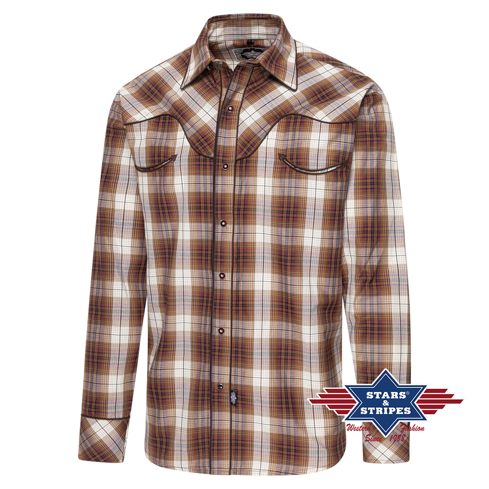 This western shirt features a classic checked pattern in warm brown and beige tones. The typical western yoke, dark piping, patch breast pockets and western cuffs with 6 press studs give the shirt authentic cowboy charm. A versatile shirt that is ideal for casual yet stylish outfits.
