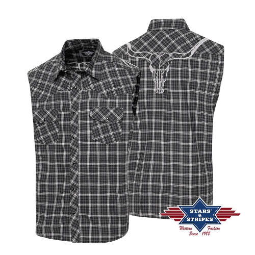 Checked, sleeveless western shirt with western yoke and patch breast pockets. Matching press studs on the button placket and a large embroidery on the back make this shirt a real highlight.