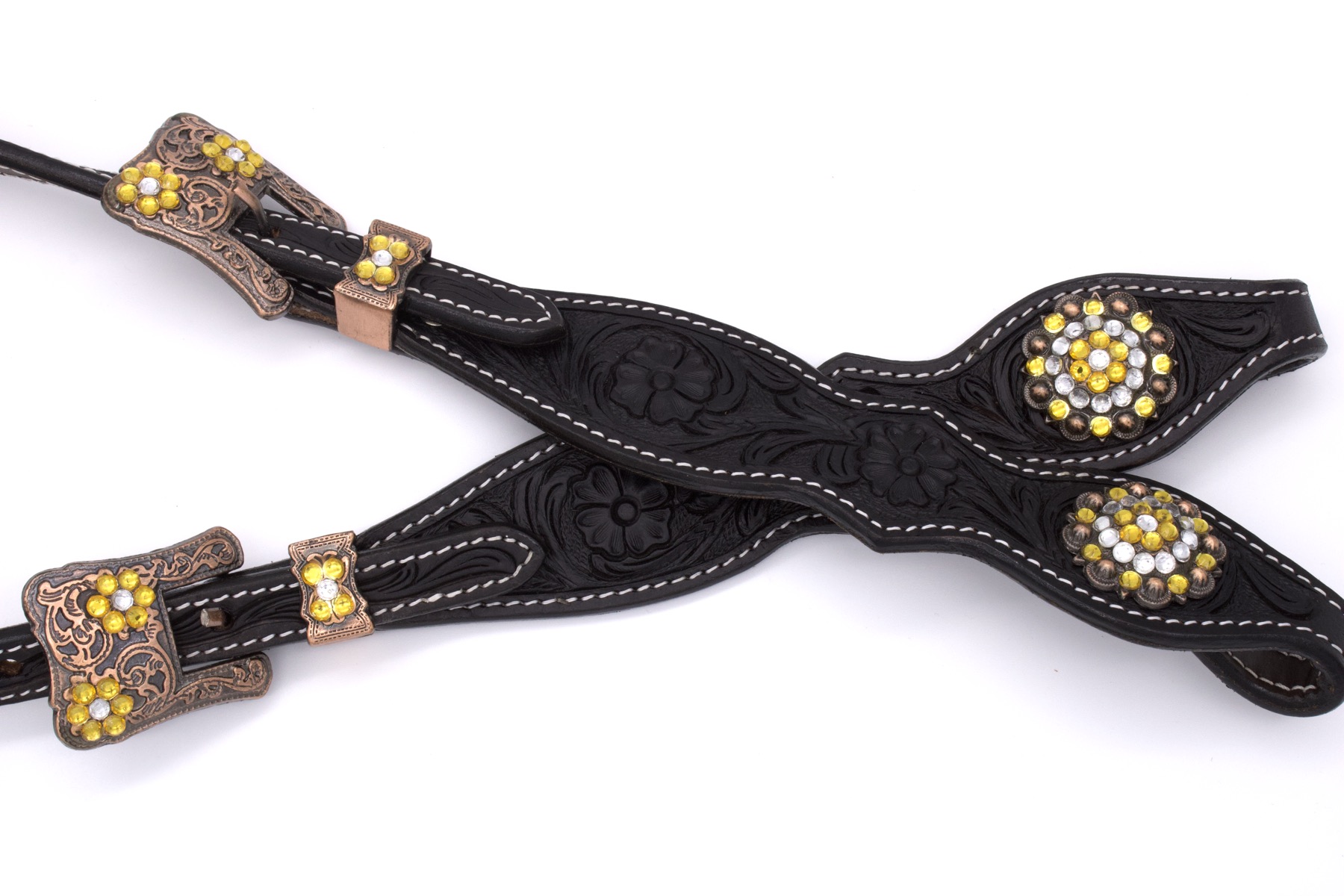 - filigran gestaltete Schnallen und Conchos mit goldfarbenen Strasssteinchen
